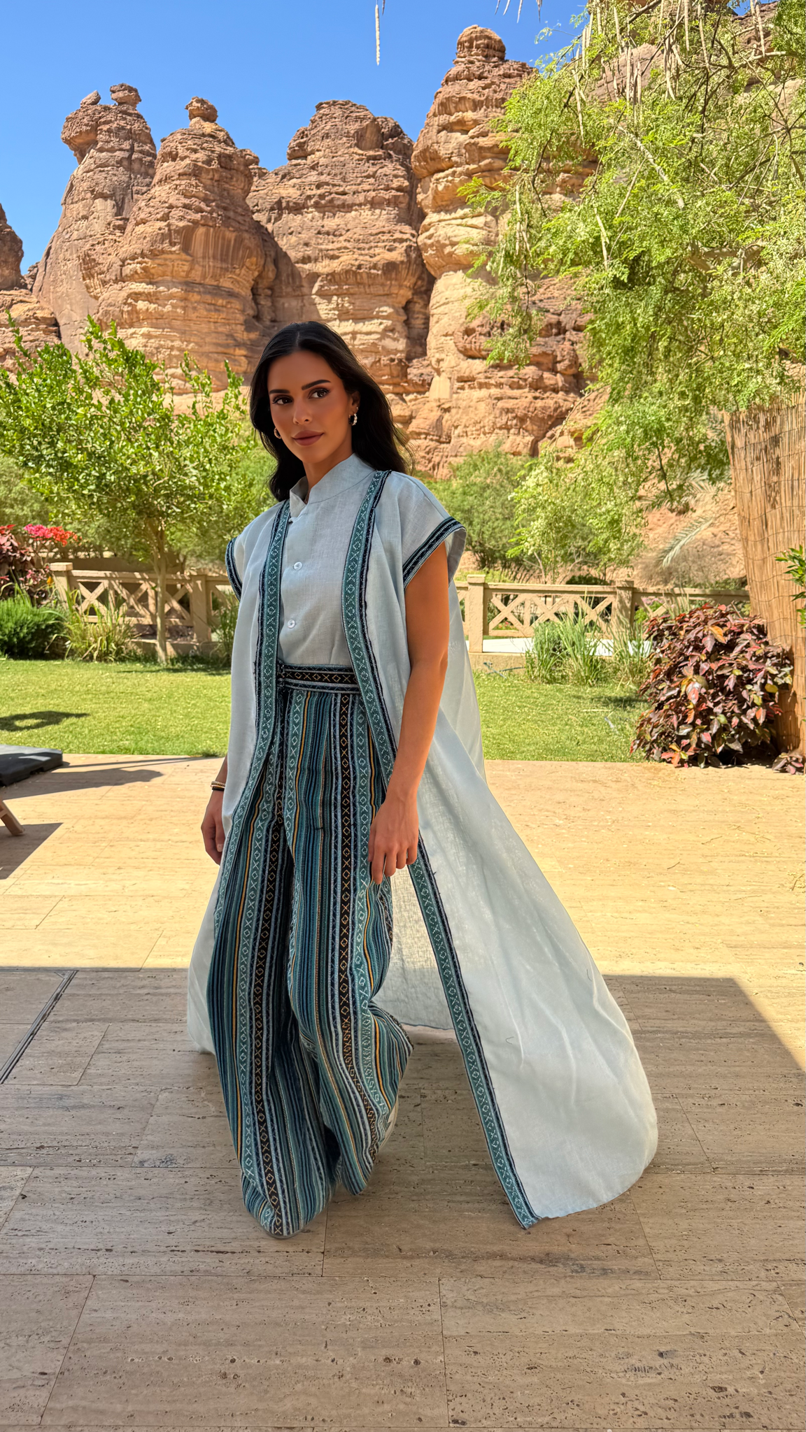 Piece details This piece is a beautiful, long sleeveless robe or open abaya-style layer, featuring minimal design with bold traditional trim detailing—elegant and serene with clear cultural roots —bringing a touch of heritage to your every step.